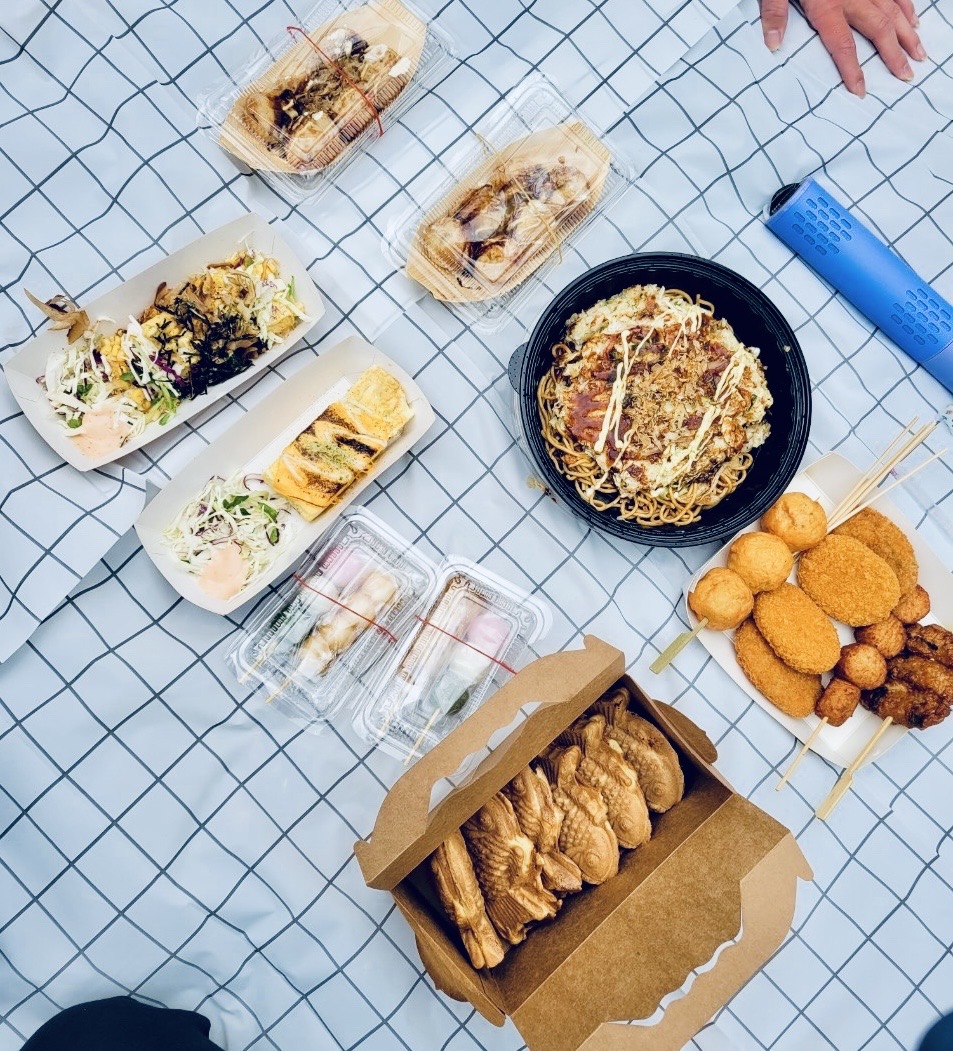 從大門出發,大概要上坡走個20分鐘才會到櫻花樹的野餐區,途中還會看到許多遊樂設施,同行的親友都迫不及待想去玩了。到了櫻花樹林後,發現有要野餐的人不算多,隨便都能找到一塊空地,自備野餐墊來,真的好不愜意呢,來的路上我們也在園區的日式攤販買了許多點心,擺在野餐墊上增添幾分日式氣息,雖然價格貴了點,但餐點本身是很好吃的。