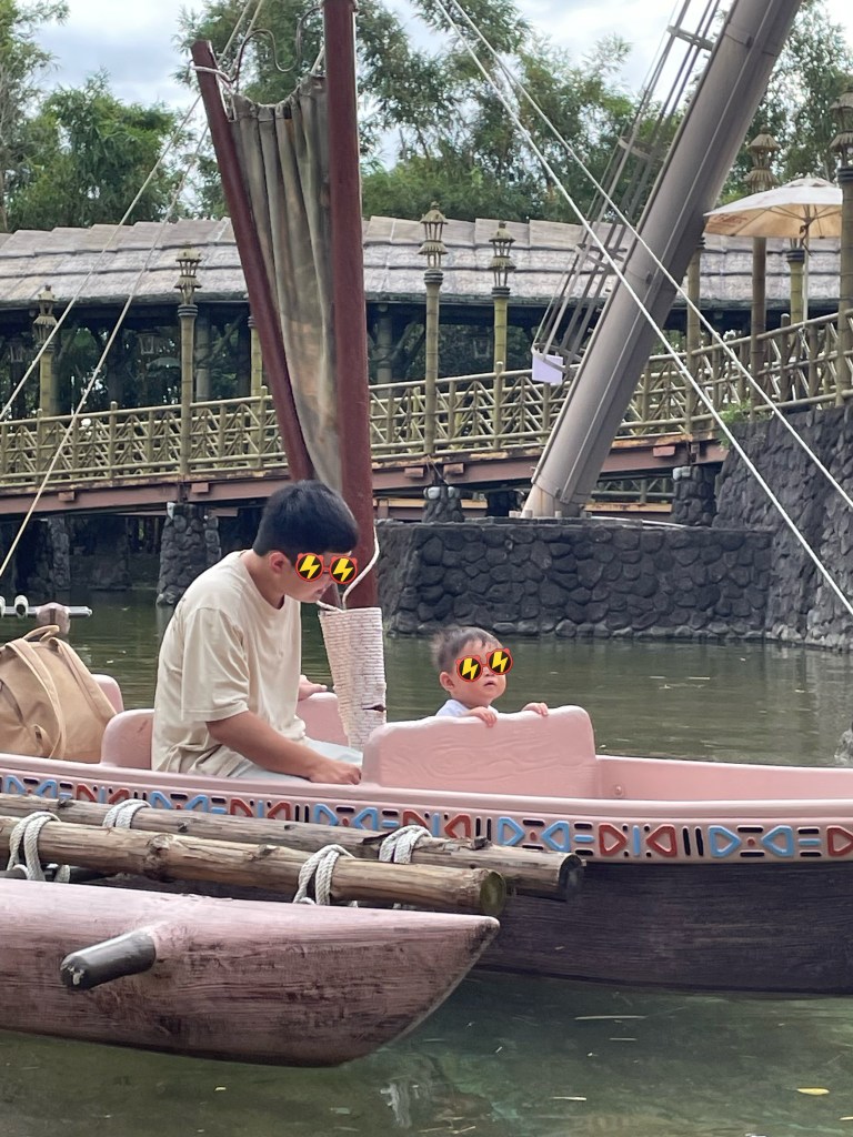 經過了剛剛小小孩有點驚魂未定的木馬後,來坐這個超級溫和的獨木舟,他是木船很緩慢的在水面沿著水里的軌道移動,速度比走路還慢,小小孩坐了都很喜歡,缺點是一台只能坐2人,所以排隊消耗速度很緩慢,人不多也排了半個小時,排之前要有個心理準備,但弟咕很喜歡,結束到站時還拍拍手很開心~