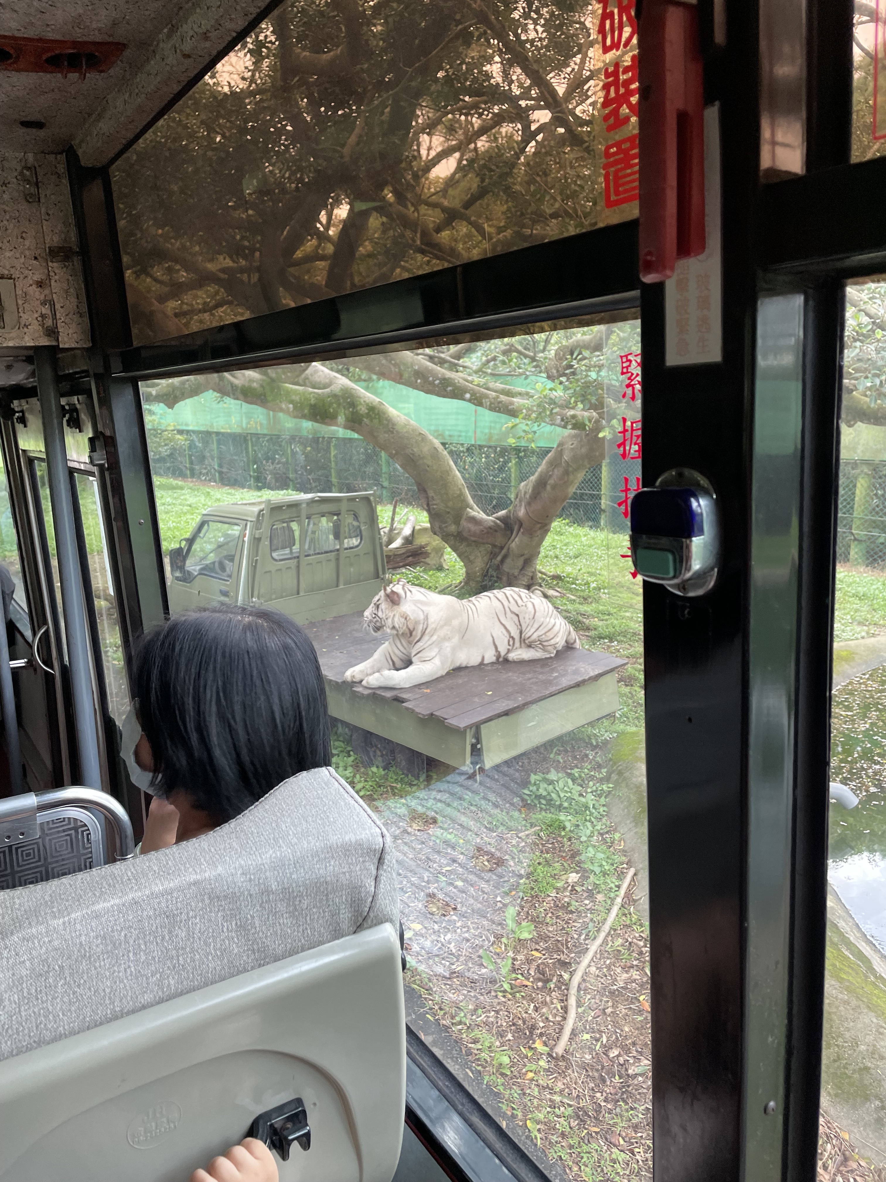 猛獸巴士站就在蒸汽火車的旁邊,推薦大家可以安排在一起,剛剛看的蒸汽火車都是偏草食性的動物,猛獸區就包含了孟加拉老虎、非洲獅子等猛獸。是以坐巴士的方式移動,司機大哥會找到近距離觀察的動物停下來並有播放解說,動物們看起來很有活力,體格也很好,比新竹動物園的動物壯碩許多XD