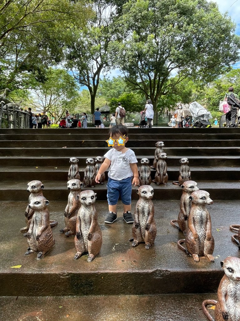 一進去的時候,會先到動物園區,這邊有超可愛的猢獴雕像,跟小小孩站在一起真的超Q的,可以當好朋友的身高~ 適合小小孩的景點是蒸汽火車跟猛獸巴士,我們到的時候人很多,就先往後玩了,晚點再來排~