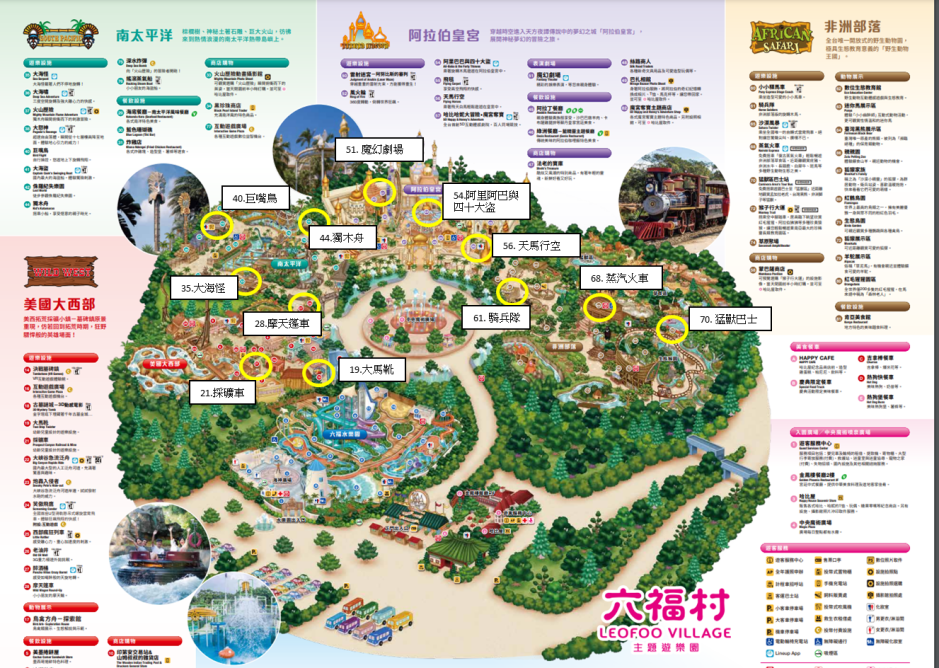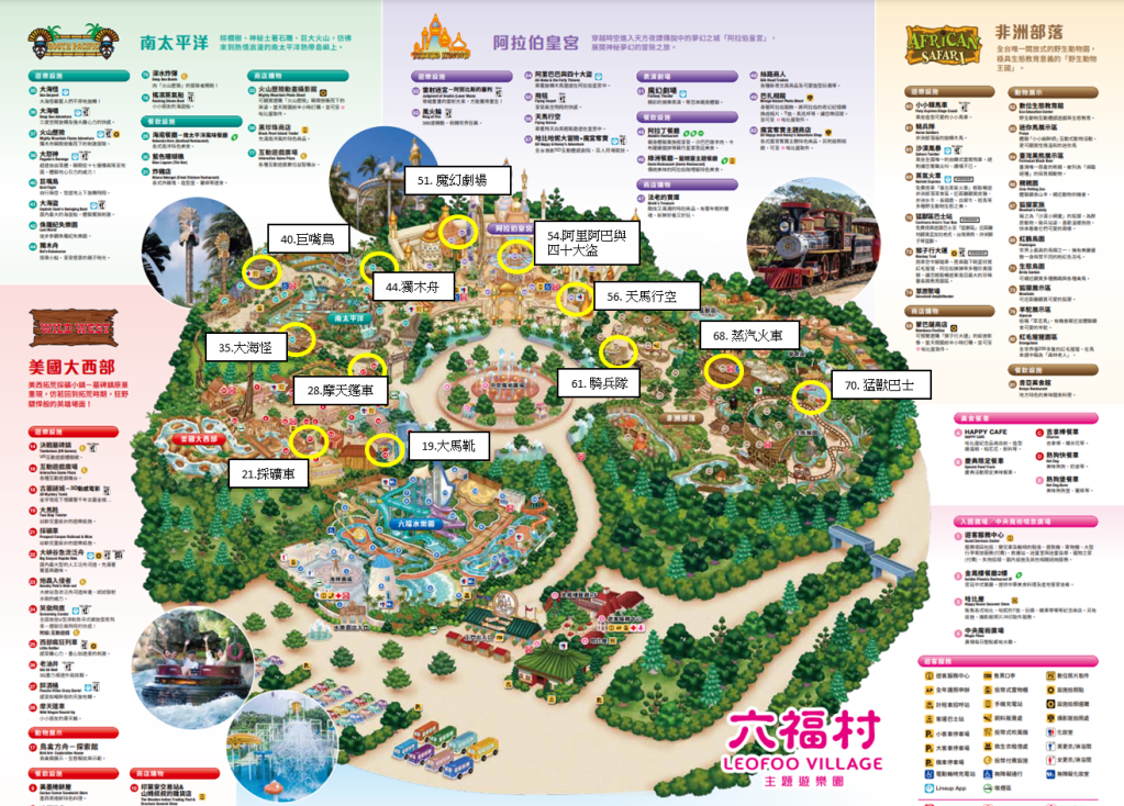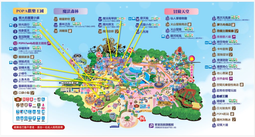 其實官網很貼心,都有把90CM以下需大人陪同的遊樂設施列出來,也有設施的圖片可參考,下面這張圖露比幫大家整理好各設施的位置,這樣進遊樂園的時候就很好找囉!