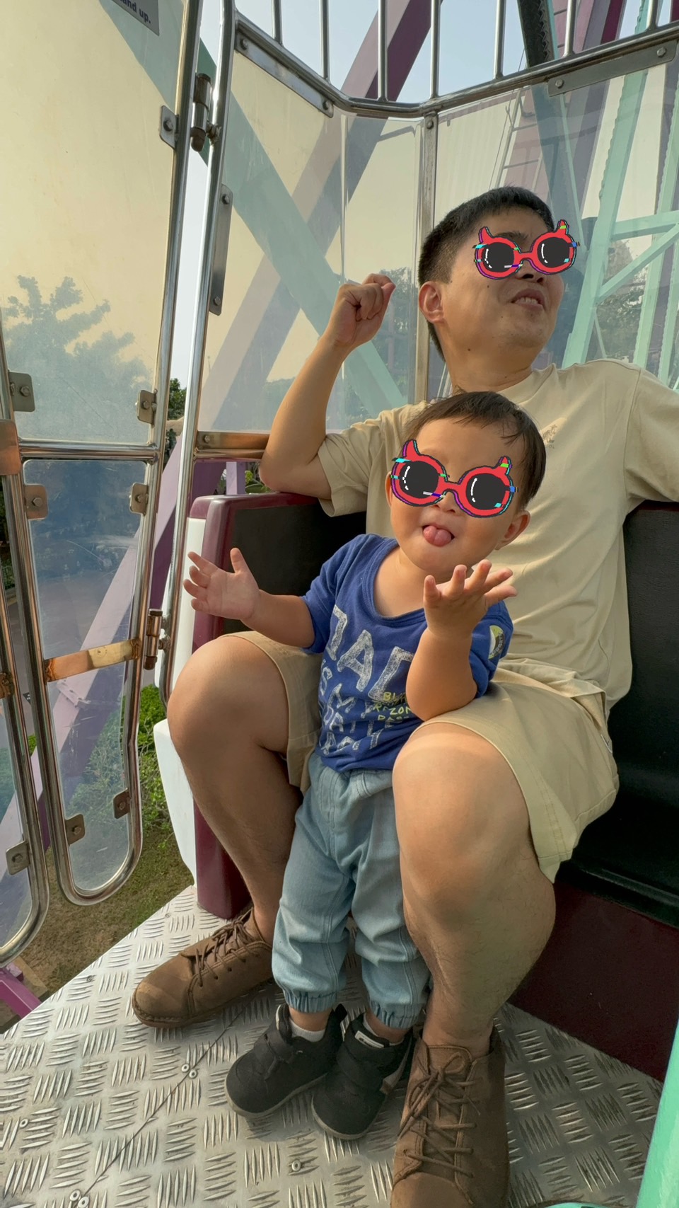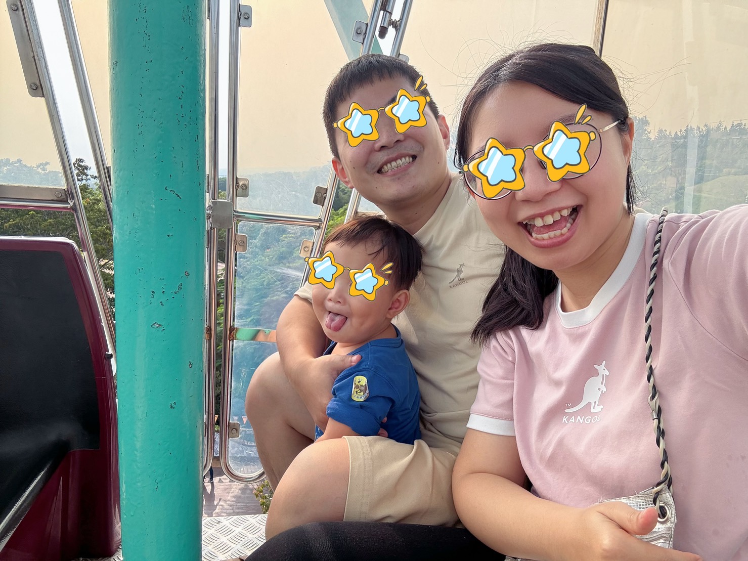 麗寶樂園的摩天輪是小型的,搭一趟大概15分鐘左右,第一次搭摩天輪的弟咕非常適應,拍樂很多搞怪照片,很適合放在行程的中段,在裡面坐一下看看風景,也可以吃個小點心,非常Chill~