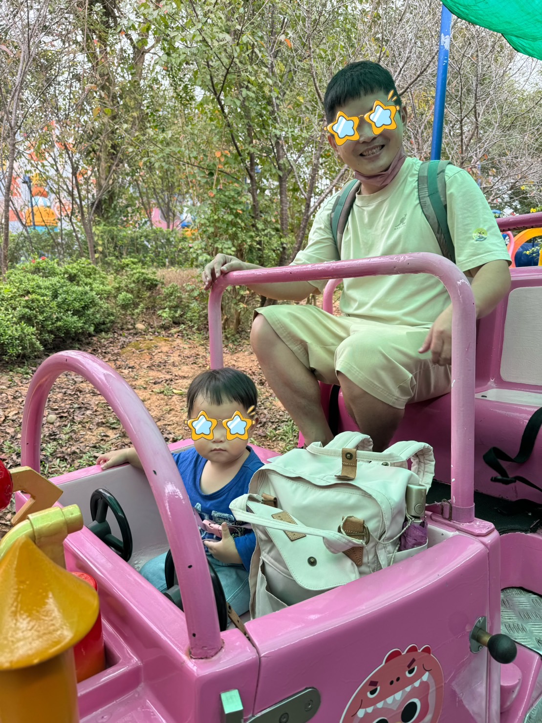 時光旅行我覺得是一項很特別的設施,是小火車類型的,每一輛小火車可以坐兩大兩小,前排限制只能給小朋友坐,所以建議要一歲半以上才比較穩定,有點像小朋友當司機載爸媽旅行的感覺,弟咕超級喜歡,坐了不想下來,還好今天人很少,總過坐了三次才滿足,也許是繞一圈的時間很短,坐一次真的還不過癮啊!