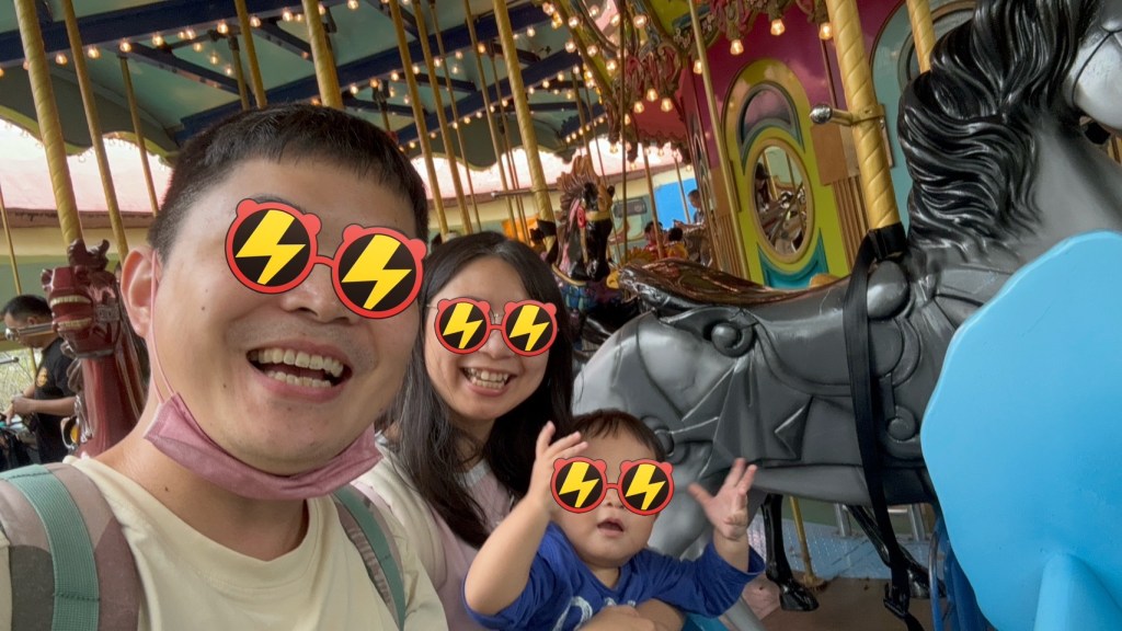進大門後往左手邊走,會比較快玩到小小孩的設施,第一站就是旋轉木馬,麗寶的旋轉木馬非常適合小小孩,有三人座的馬車,可以讓不敢做高馬的小朋友跟家長一起坐,這次坐低估還是蠻有恐懼感的,還好有大坐位,希望下次就不會害怕了。